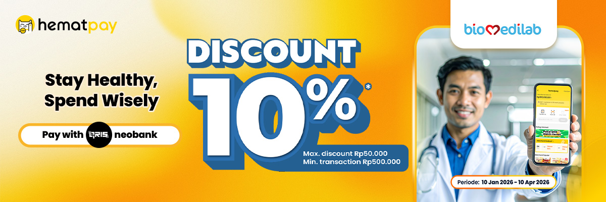- During the promotion period, users who pay using BNC QRIS at Biomedilab will get a 5% discount (up to Rp50 K) with a minimum spend of Rp600 K,Discounts are available for the 600 transactions during promo period.