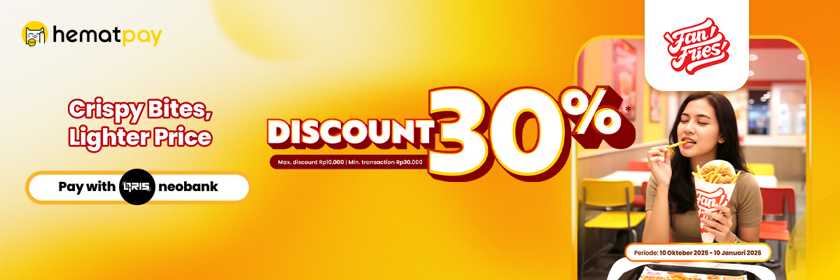 - During the promo period, users who pay using BNC QRIS at Fan Fries will get up to 30% discount max Rp10 K with minimum spend Rp30 K. Discounts are available for the first 1.000 transactions every month. Each user has 2 chances per month (1 chance per day).