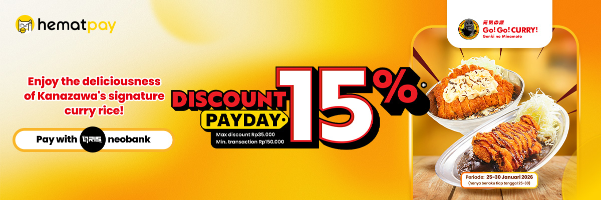 - During the promo period, users who make their payment with BNC QRIS at offline store Go! Go! Curry will get 15% off discount up to Rp35 K with minimum spend Rp 150 K. Discounts are available for the first 150 transactions every month. Each user has 1 chance per month (1 chance per day).