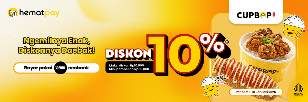 - Selama periode promo, pengguna yang melakukan pembayaran menggunakan QRIS BNC di offline store Cupbop akan mendapatkan diskon 10% sampai dengan Rp10 rb dengan minimum pembelian Rp50 rb. Diskon akan diberikan ke 200 transaksi pertama tiap bulan. Setiap pengguna memiliki 2x kesempatan untuk mendapatkan diskon (1x per hari).