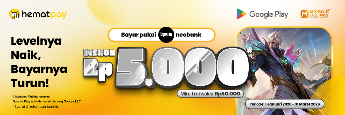 - Selama periode promo, pengguna yang melakukan pembayaran pertama dengan hematpay (QRIS BNC) di Google Play min. Rp50rb akan mendapatkan diskon instan Rp5rb. Diskon berlaku untuk 33 transaksi pertama selama per hari.